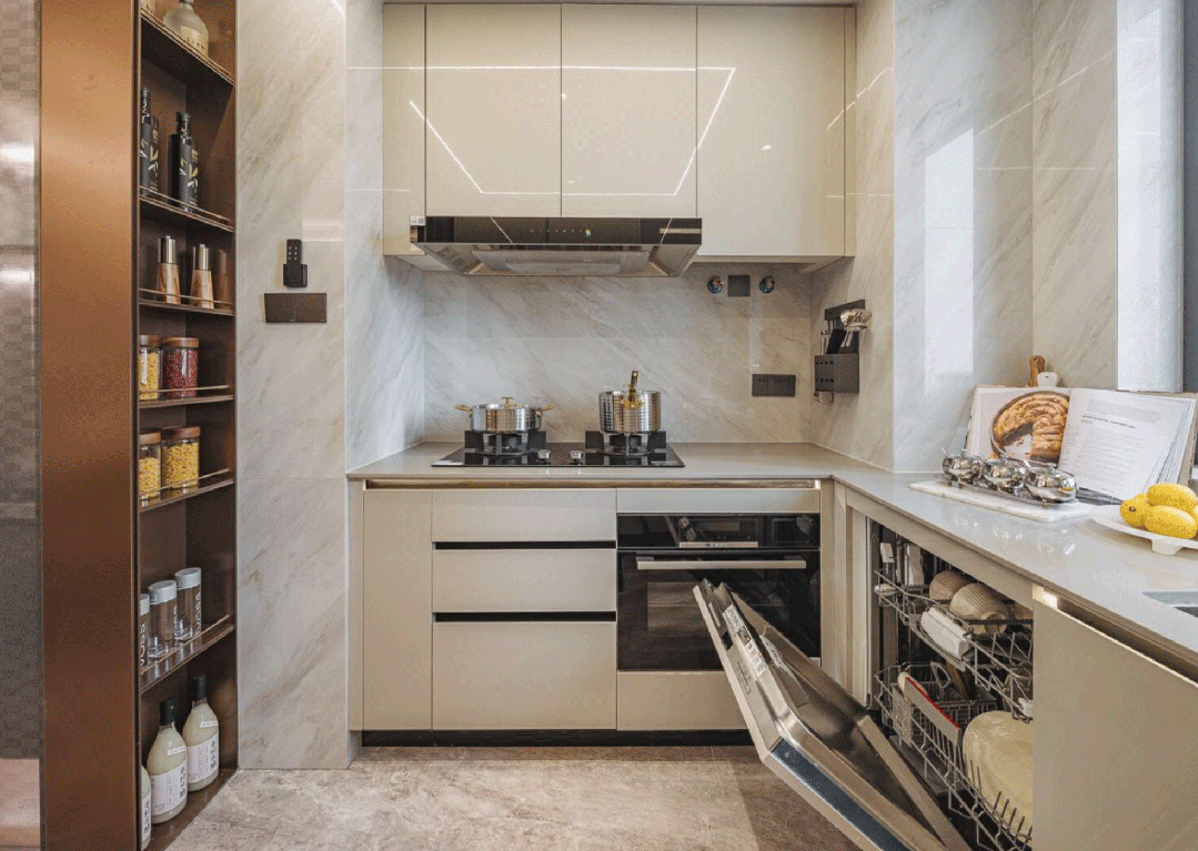 针对餐厨收纳保利·海上瑧悦立异打制900mm立案的双面岛台收纳空间,